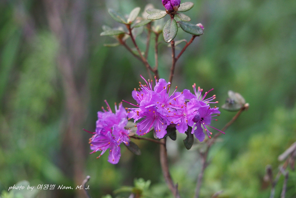철쭉처럼 피었지만 꽃이 작은 상럭의 잎을 가진 황산차