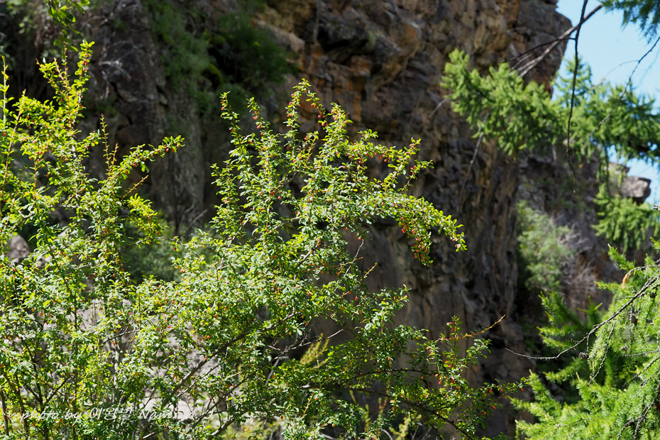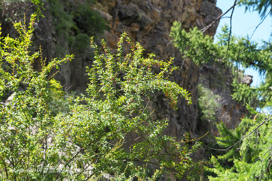 오르혼강 유역매 현무암 바위 틈에서 자라던 시베리아매자나무의 고운 열매가 시선을 빼앗는다.