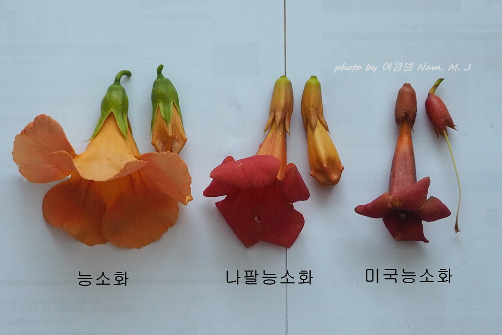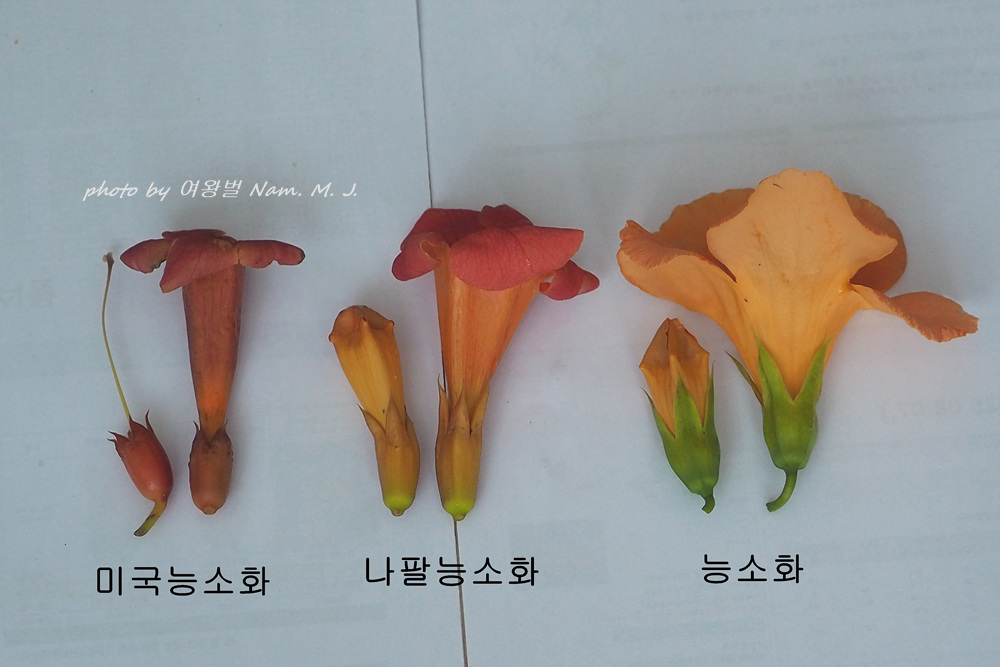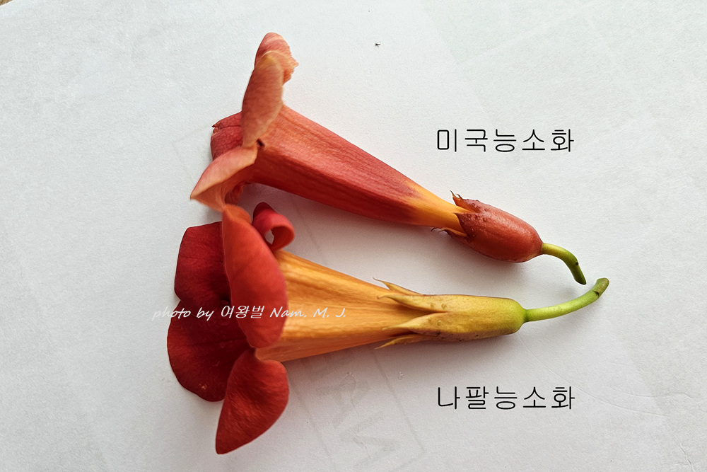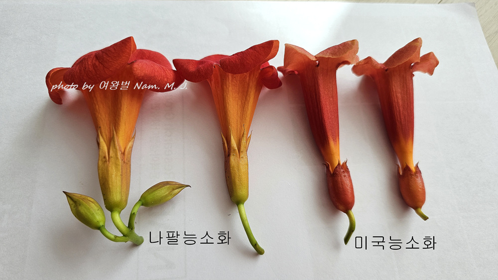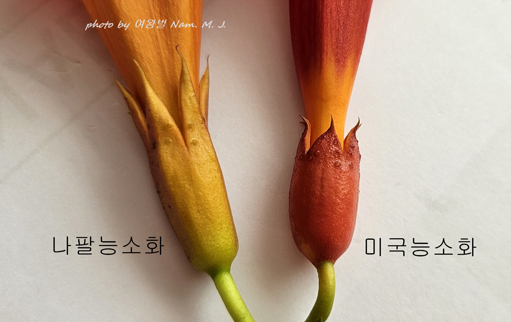 능소화는 화관이 크고 꽃색이 등황색으로 화관 통부가 넓고 짧으며 꽃받참도 녹색을 띤다.