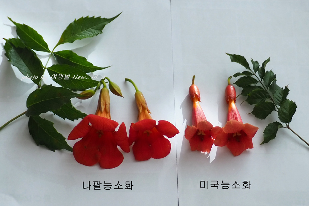나팔능소화- 꽃이 크고 붉은색, 화관통부가 넓고 꽃받침이 등황색![]() |