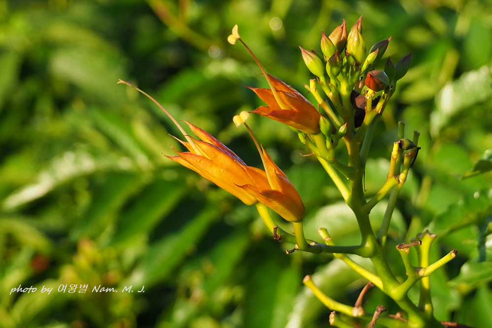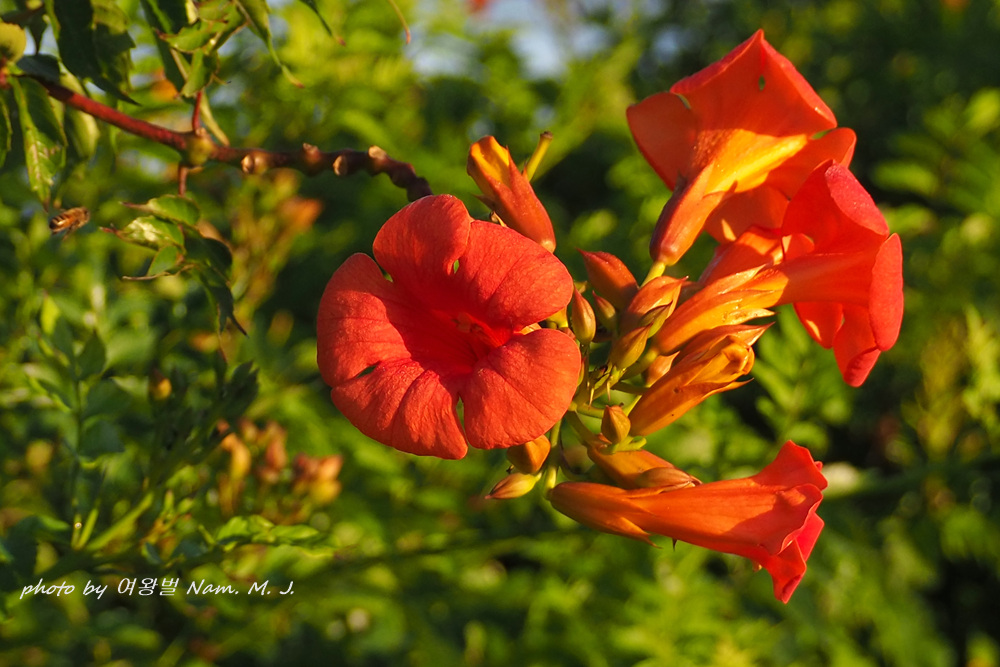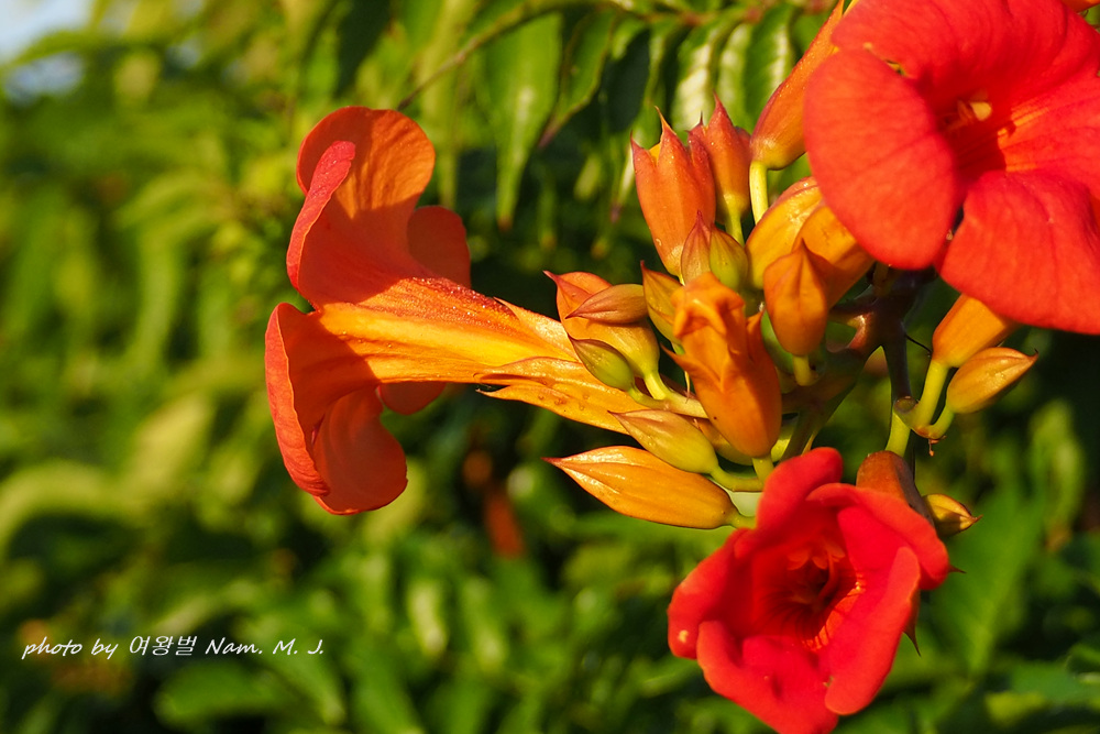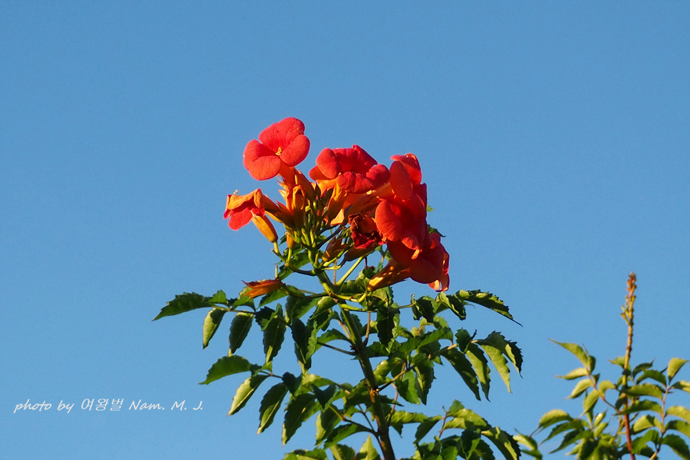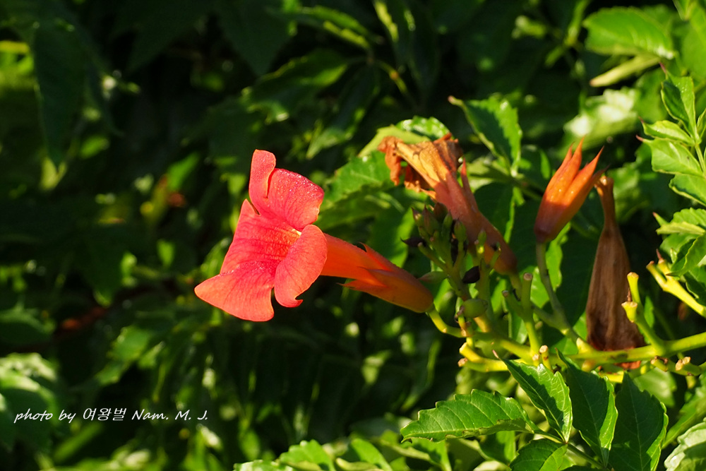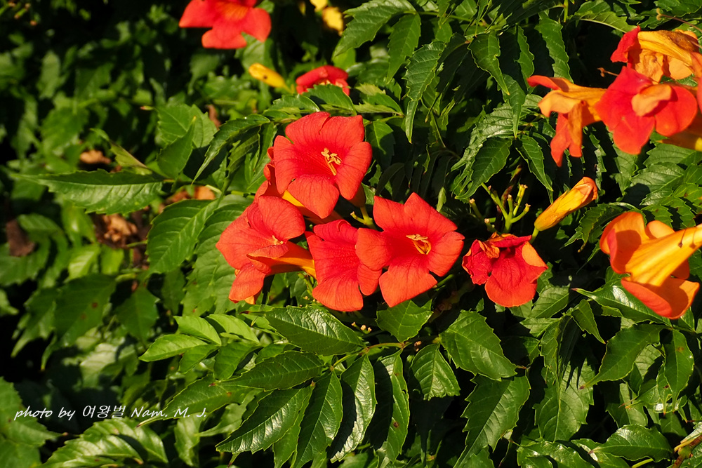 꽃색이 능소화 보다 붉고 화관이 더 길며 꽃받침은 등황색,