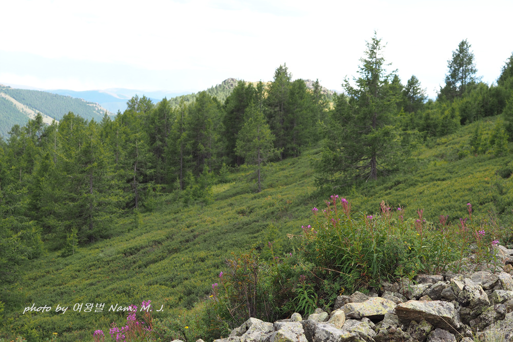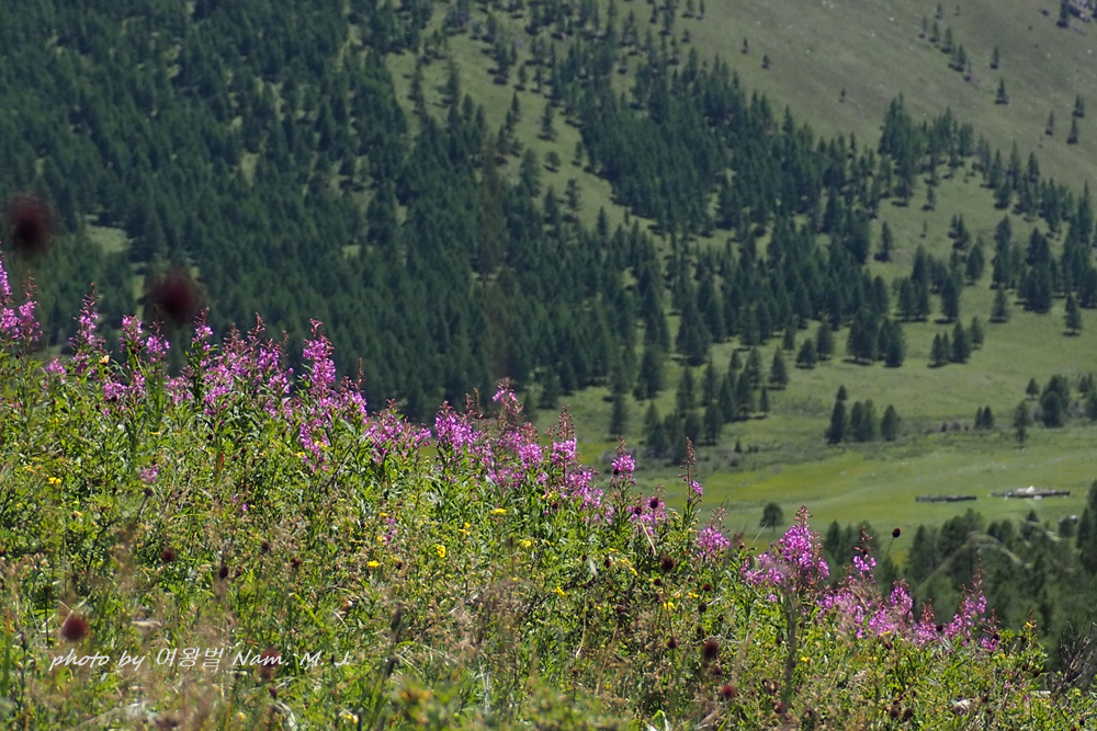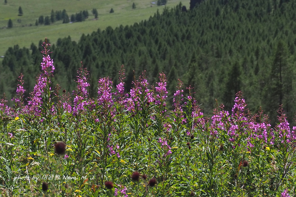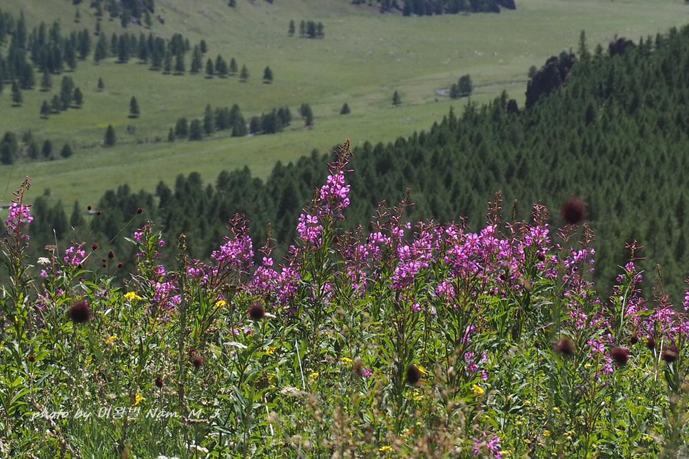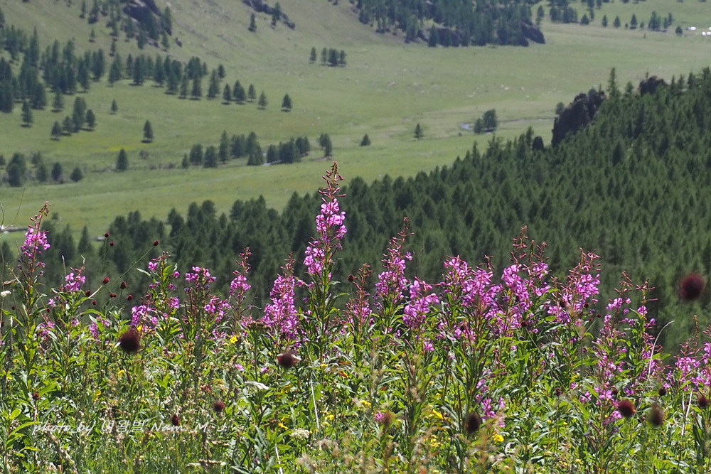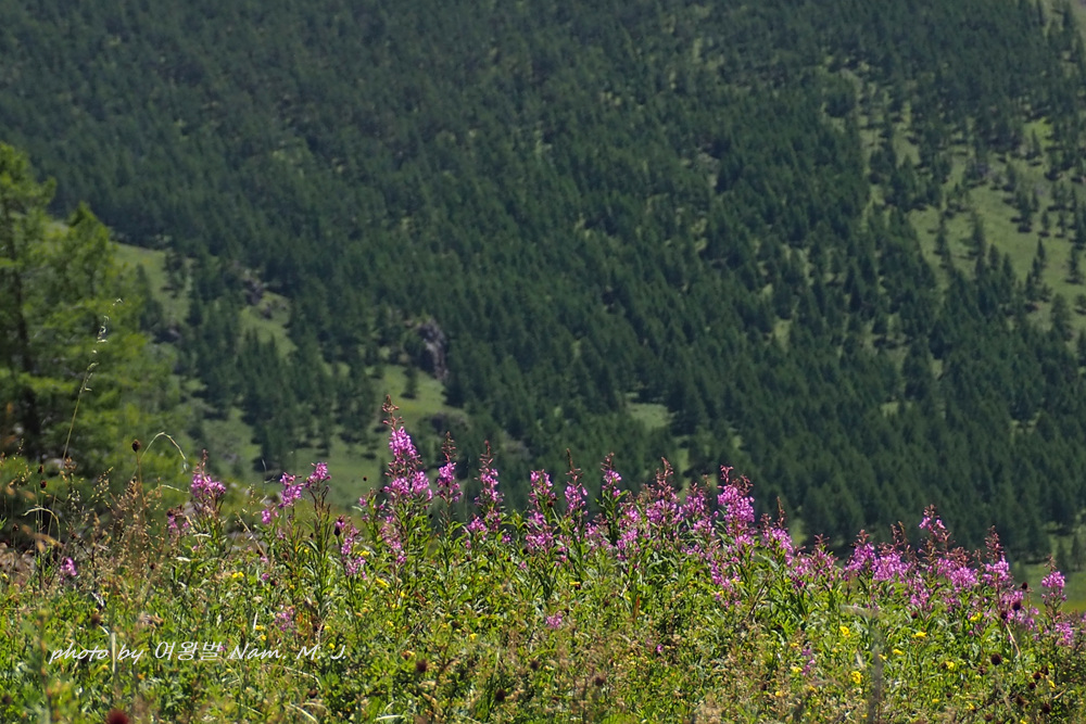 몽골 산지 여기저기 분홍바늘꽃이 한창이다.