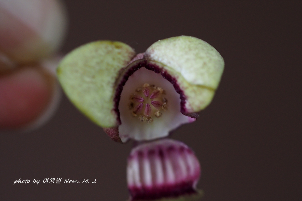 꽃받침은 3개의 열편으로 갈라지며 녹색, 열편은 삼각상 난형, 기부에 자색의 링모양의 테가 있다.