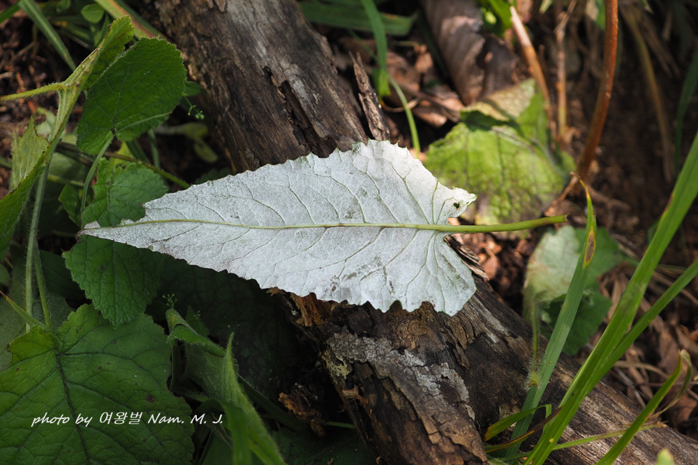 엽질이 두텁고 잎 표면은 녹색이고 뒷면에는 솜털이 밀생하며 백색이다. 총포에 거미줄 같은 백색털이 있다.