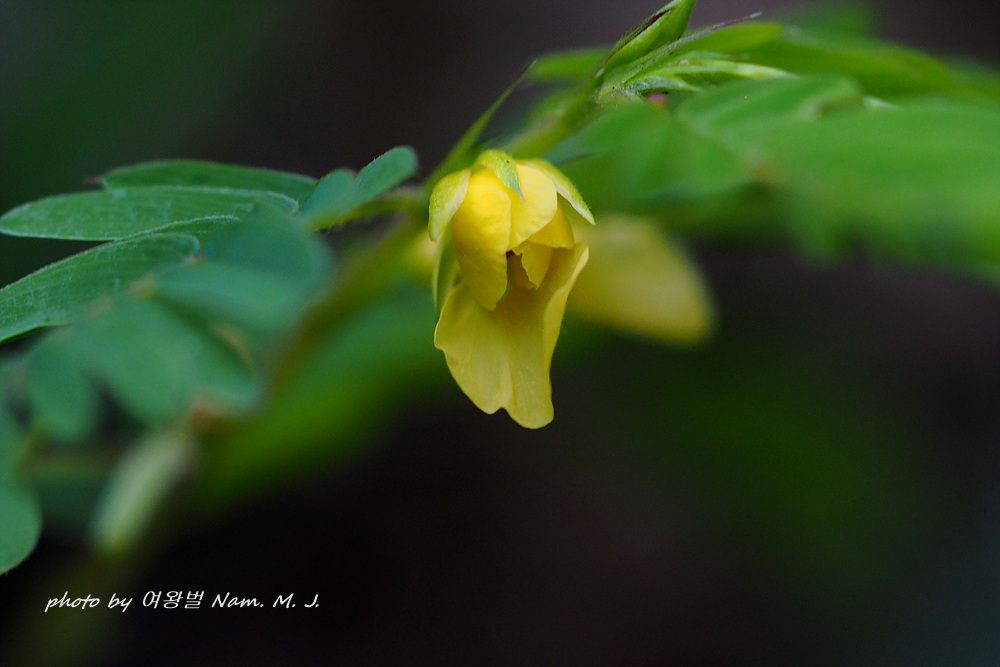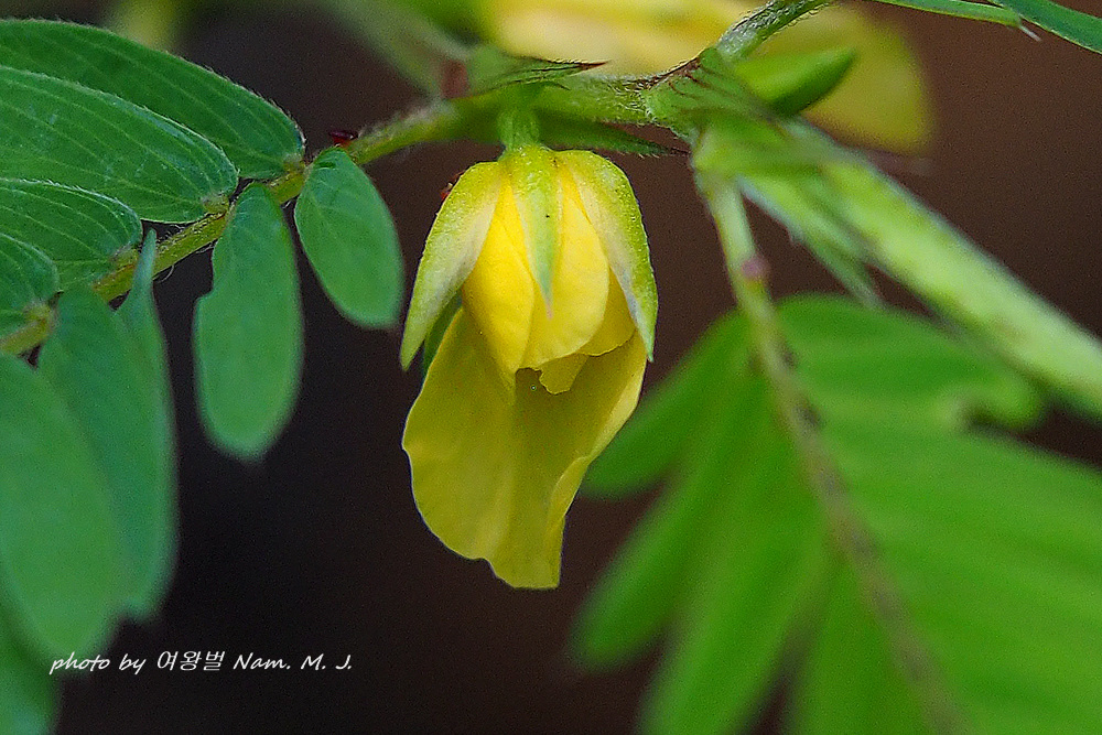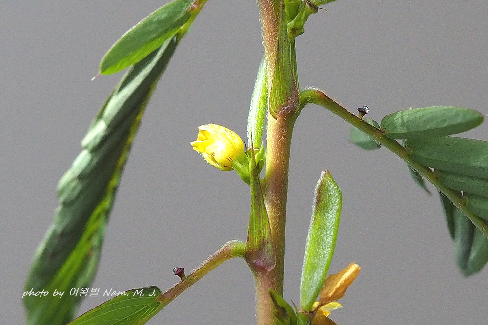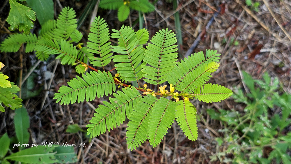 촬영을 하기 위하여 주변 어설픈 풀을 치우느라고 줄기를 건드렸는데 미모사 처럼 잎을 서서히 접었다.