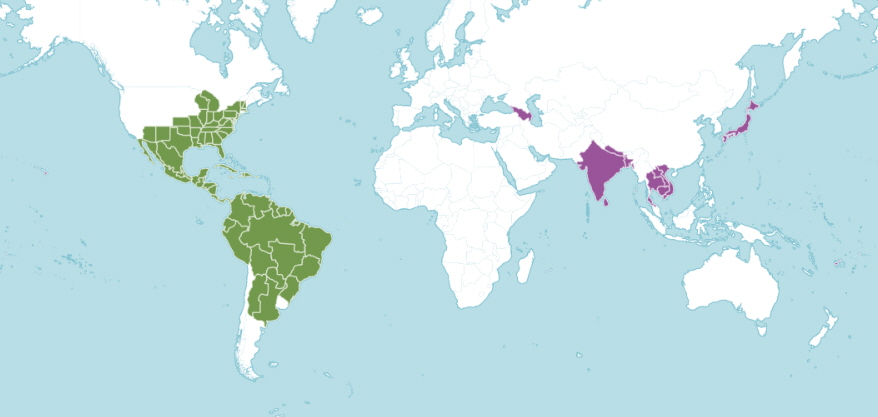 이 종의 원산지는 중부 및 미국 동부에서 열대 및 아열대 아메리카인데 일본에도 이미 유입이 되어 있다.
