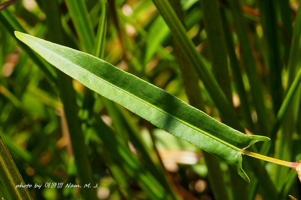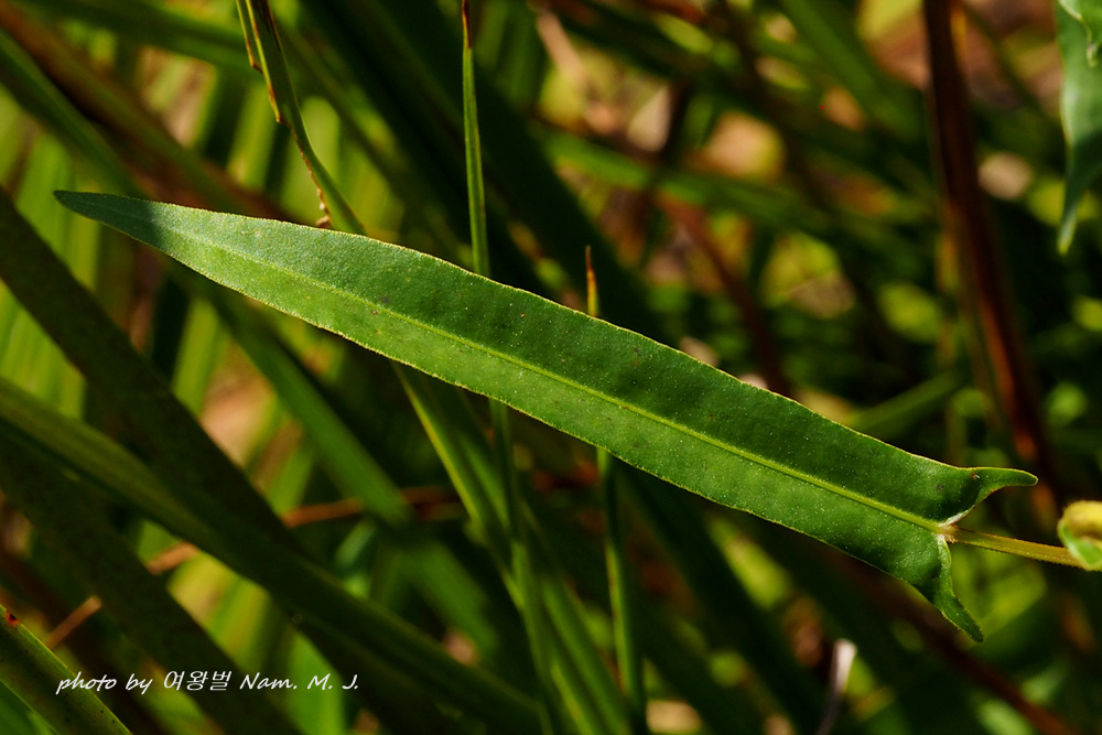 잎이 난상 긴 타원형 또는 피침형으로 길고 좁으며 끝이 뾰족하고 밑부분이 화살밑처럼 되며 길이 6~11㎝ 정도로서 열편 끝이 뾰족하고 양면에 털이 없다.