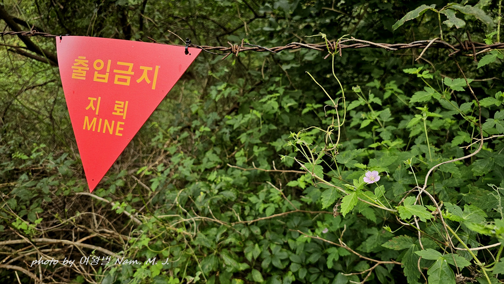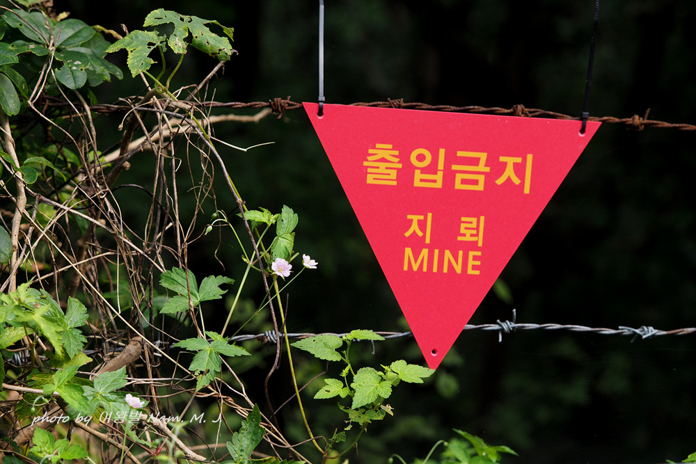 지뢰가 있다는 위험 경고 표지가 달린 붉은 깃발을 매단 철망이 둘러쳐져 있다.