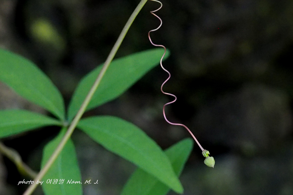 가늘고 용수철처럼 감기는 긴 소화경과 작은 화관, 그리고 5-7매의 우상으로 갈라지는 잎 등이 특징이다.