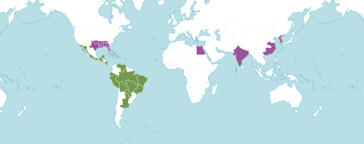 녹색은 원산지, 자색은 유입지