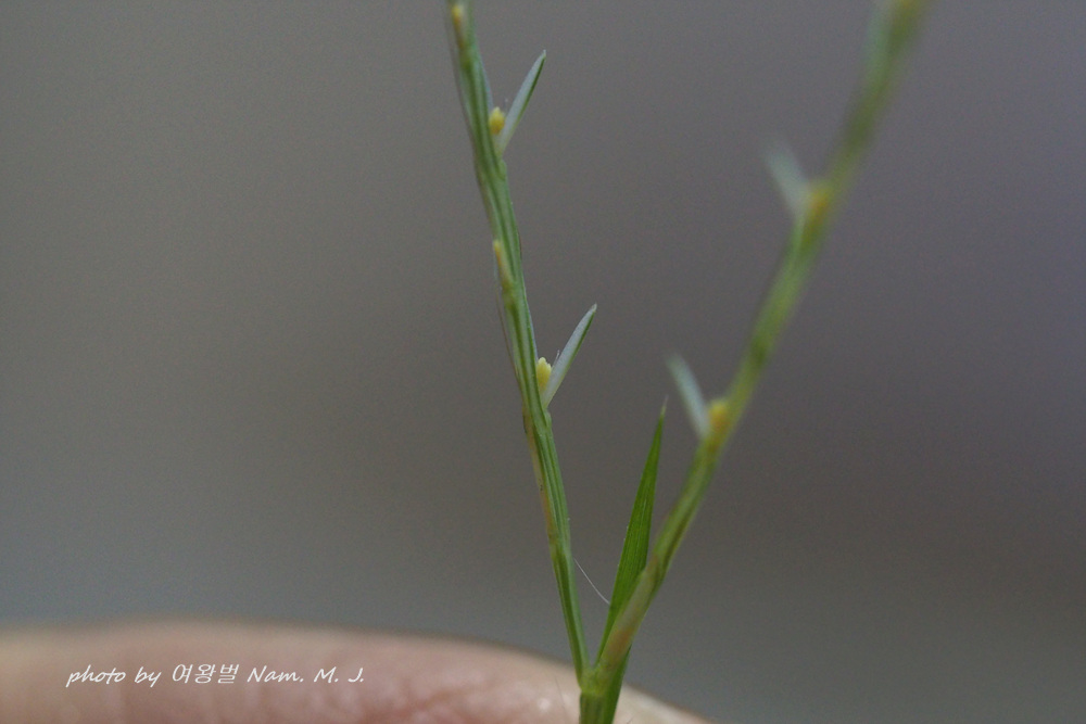 | 잔디바랭이 : Dimeria ornithopoda Trin. 습지와 산록의 습기가 많은 양지바른 풀밭에서 자라는 한해살이풀이다. 줄기는 가늘고 가지를 친다. 높이는 15~35cm이며 2~15개의 마디가 있다. 잎집에는 털이 있고, 잎혀는 흰색 막질로 길이 0.5~1.0mm이다. 잎몸은 길이 3~7cm, 너비 2~5mm이며 양면에 긴 털이 드문드문 난다. 꽃은 8월에 피는데 전체 꽃차례는 2~3개의 가지가 끝에 달리며, 길이는 3~8cm이다. 작은이삭은 가지에 두 줄로 달리고, 자루는 매우 짧으며 자루와 작은이삭의 사이에 짧은 털이 돌려난다. 작은이삭은 길이 2.7~3.8mm이며, 꽃이 두 개 들어 있고 하나는 불염성이다. 두 포영은 길이가 비슷하며, 작은이삭의 길이와 같다. 임성인 두 번째 꽃의 호영은 끝이 갈라지고 끝에 길이 4~5mm의 꼬인 까락이 달린다. 내영은 없다. 우리나라 남부지방에 나며, 인도, 일본, 중국, 오스트레일리아, 인도차이나 등에 분포한다. 전체 꽃차례의 가지가 줄기 끝에 손바닥 모양으로 달리는 것이 바랭이속 식물과 유사하지만, 호영에 길고 꼬인 까락이 있어서 쉽게 구분된다. 제2포영의 가운데 맥 전체가 용골로 되고 좁은 날개가 있는 것을 갯바랭이로 구분하기도 한다. 가지바랭이, 잔디바랑이라고도 부른다 |