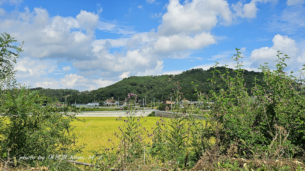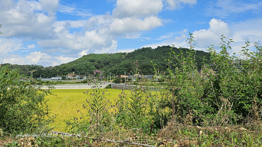 푸른 가을 하늘에 흰구름 동동 띄우고 큰엉겅퀴가 누렇게 익은 벼이삭을 굽어 내려 보고 있다.