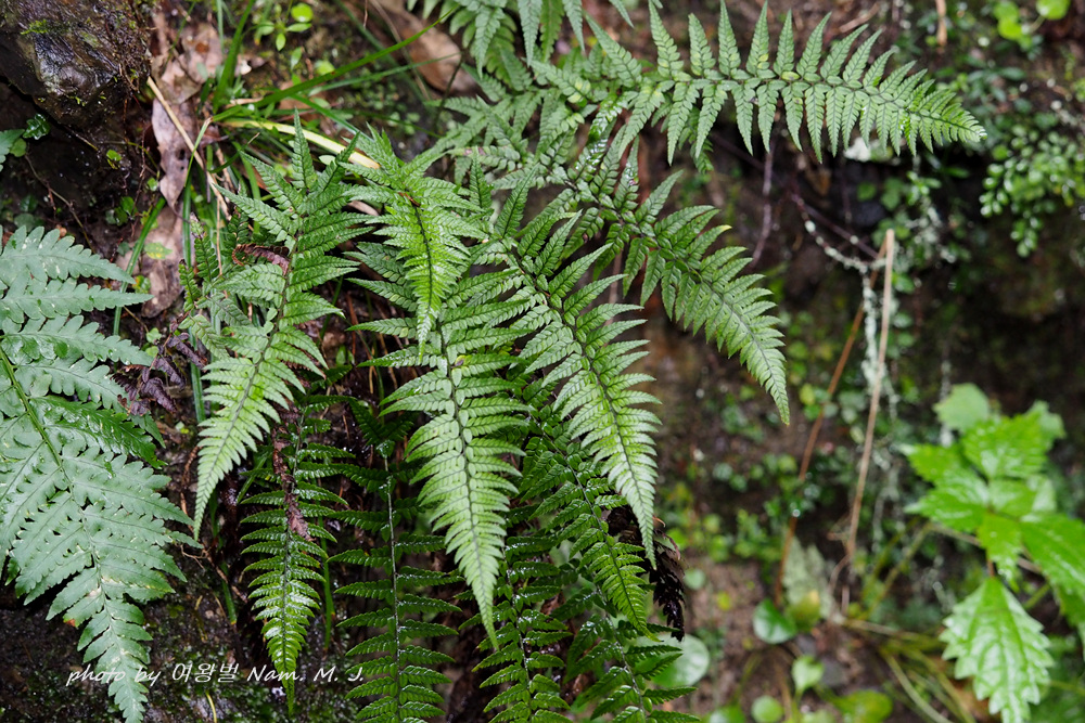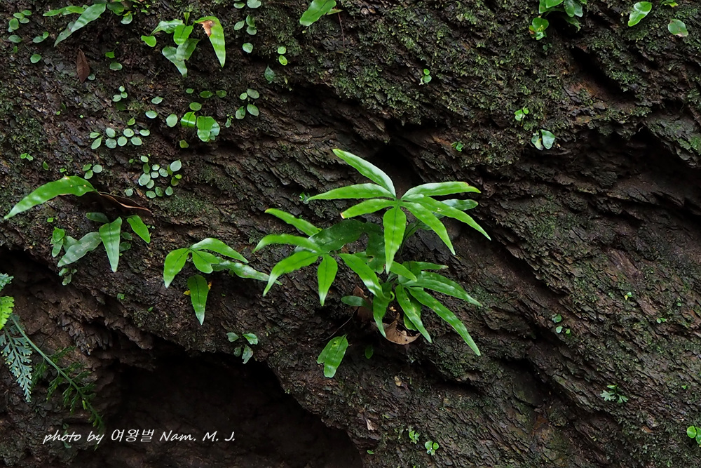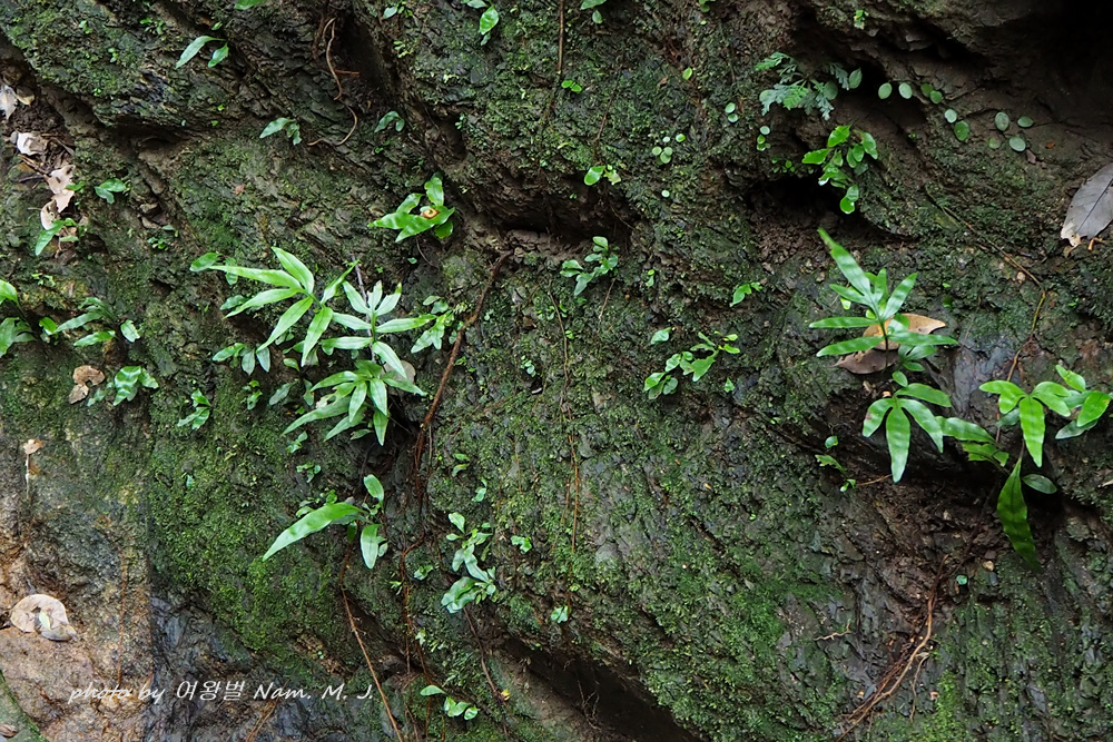 제주도에서 드물게 만나던 우산물통이가 습한 바위벽 아래 나타난다.