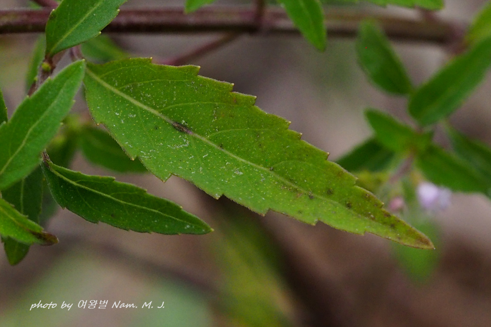 긴 타원형, 좁은 난형 톱니 작고 6-13쌍 표면과 맥 위에 잔털 화서 아래 마지막 잎의 잎자루가 거의 없다 |