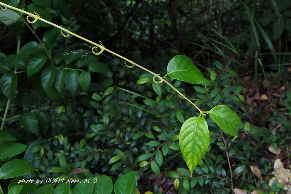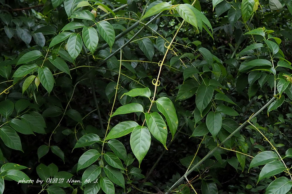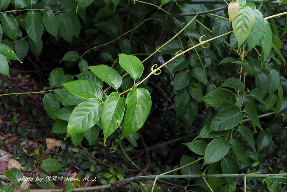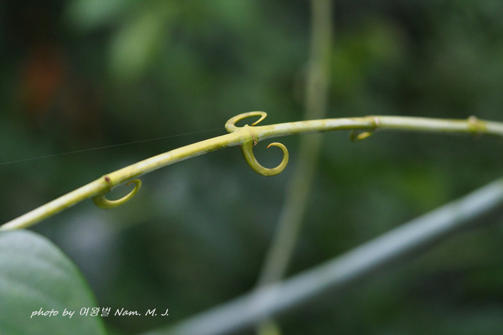 줄기 잎사이에 낚시바늘처럼 생긴 탁엽이 발달하여 중국명으로 낚시바늘덩굴이라는 뜻을 가지고 있다.