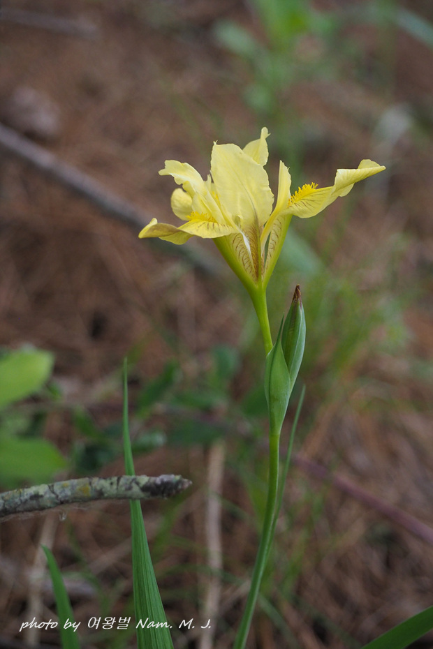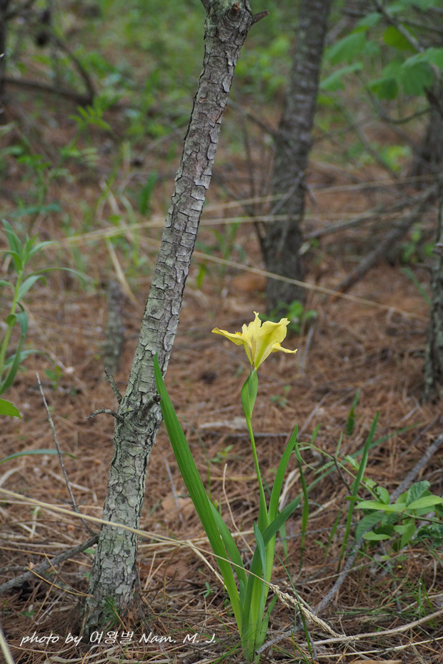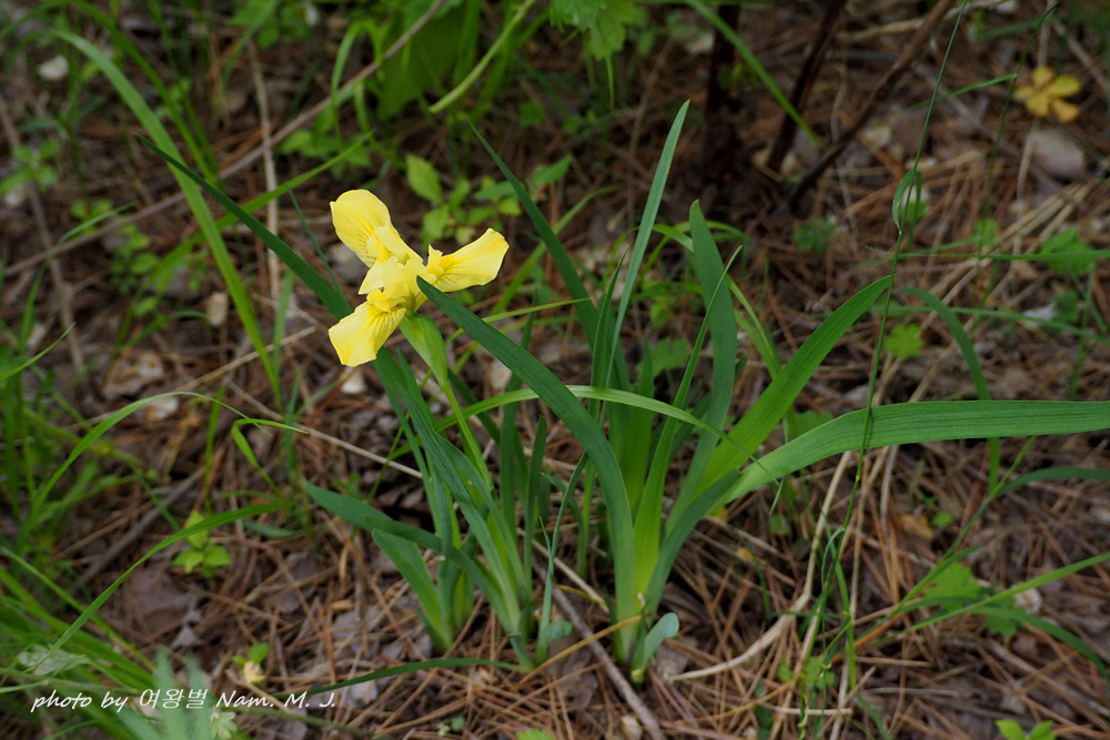 | 산지의 마른 땅에 자라는 여러해살이풀이다. 줄기는 높이 20~30cm이다. 잎은 5~6장이 모여나며 넓은 선형으로 가운데 잎맥은 없다. 꽃줄기는 1~2개, 끝에서 2개씩 연한 녹색이 도는 노란색 꽃이 핀다. 한국산 붓꽃속 식물 중에서 외화피편의 기부에 노란색 털이 밀생하는 특징으로 구분된다(출처; 국립생물자원관 포털) |