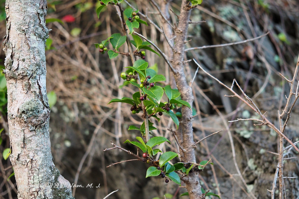 해안 절벽지대를 한 바퀴 도는데 잘 익은 열매를 달고 있는 산유자나무가 해풍과 파도를 견디면서 서 있다.
