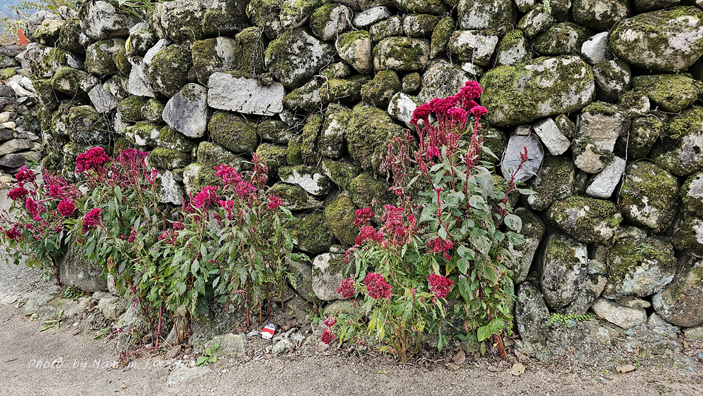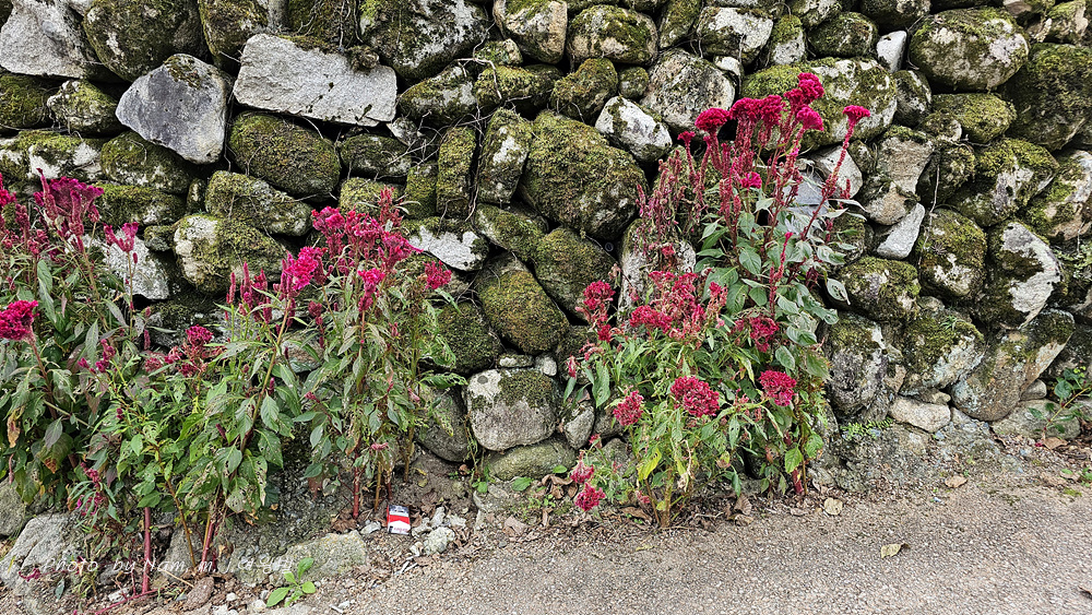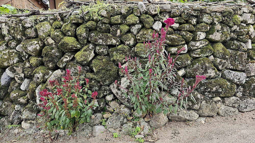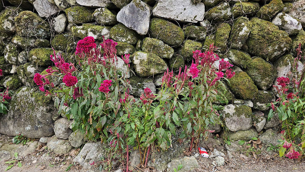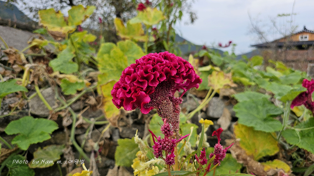 동네 돌담을 따라 붉게 피어 있는 맨드라미가 정겹다.