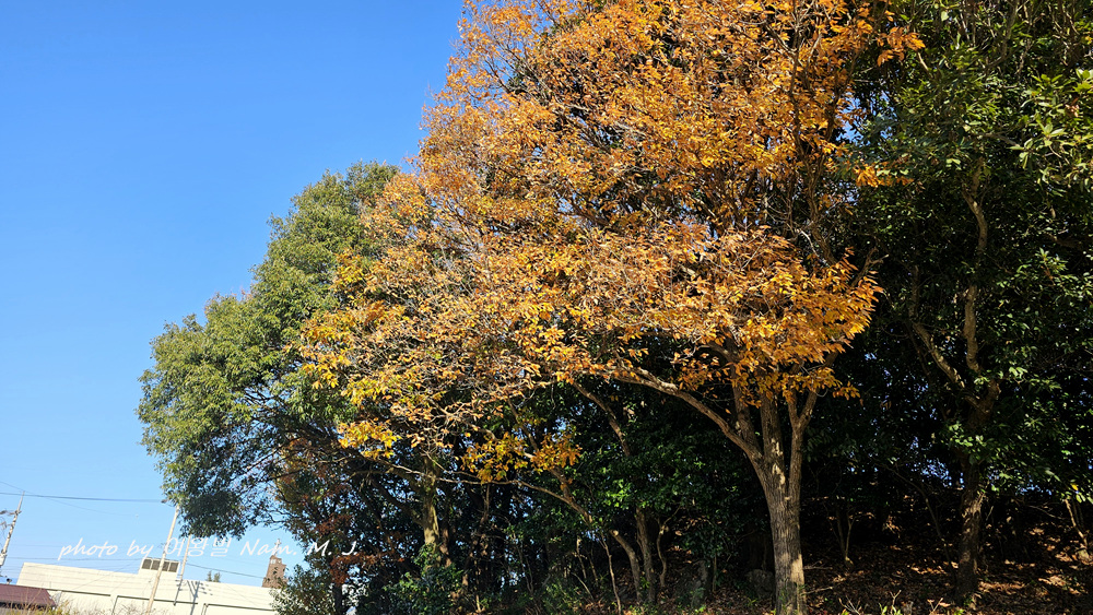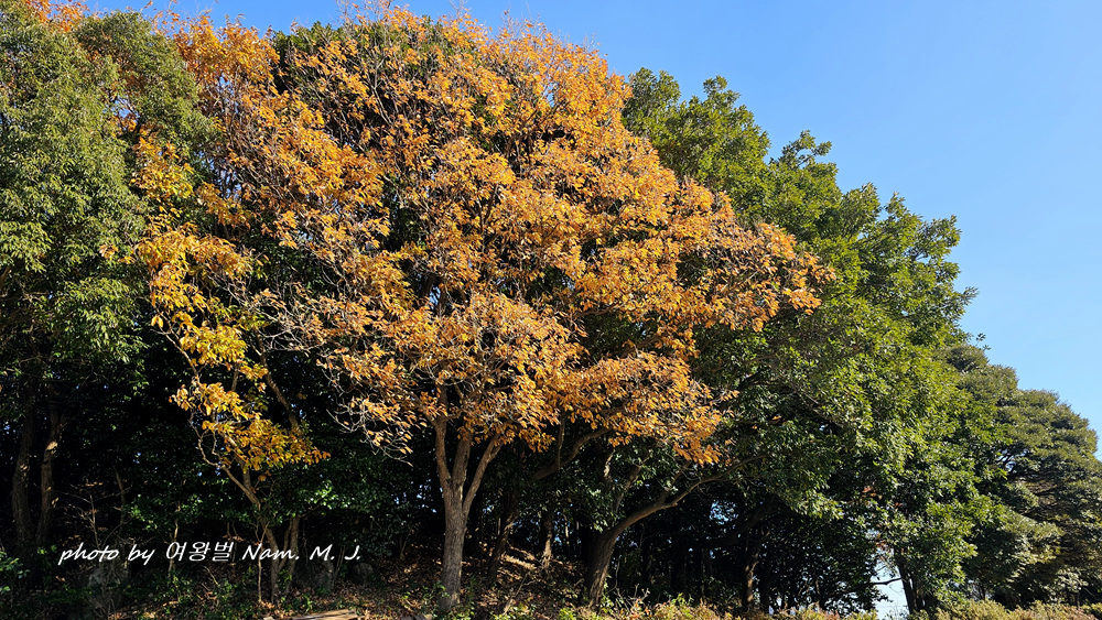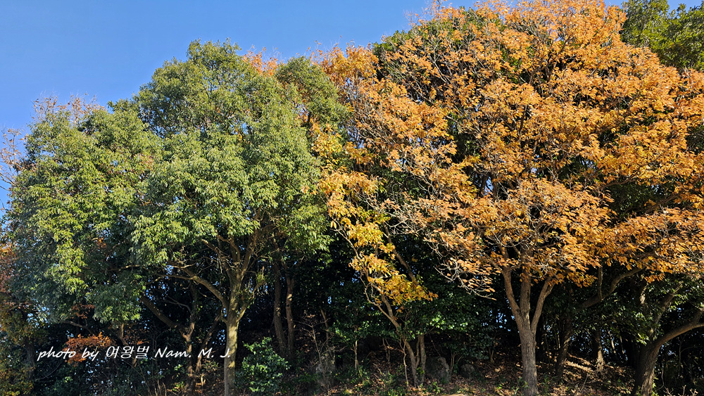 졸참나무가 누렇게 단풍이 들어서 대비가 된다.