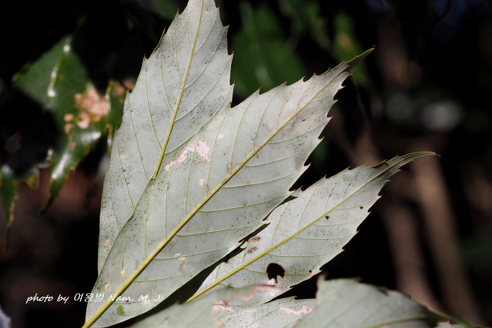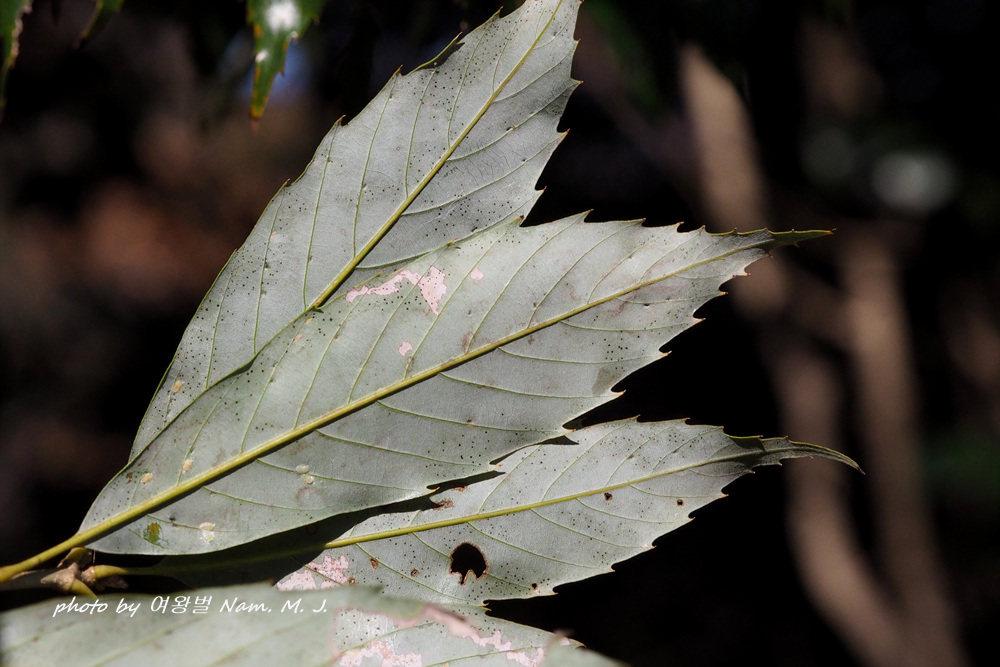 잎 표면 광택, 뒷면 분백색, 잎 상단1/3 이상 거치