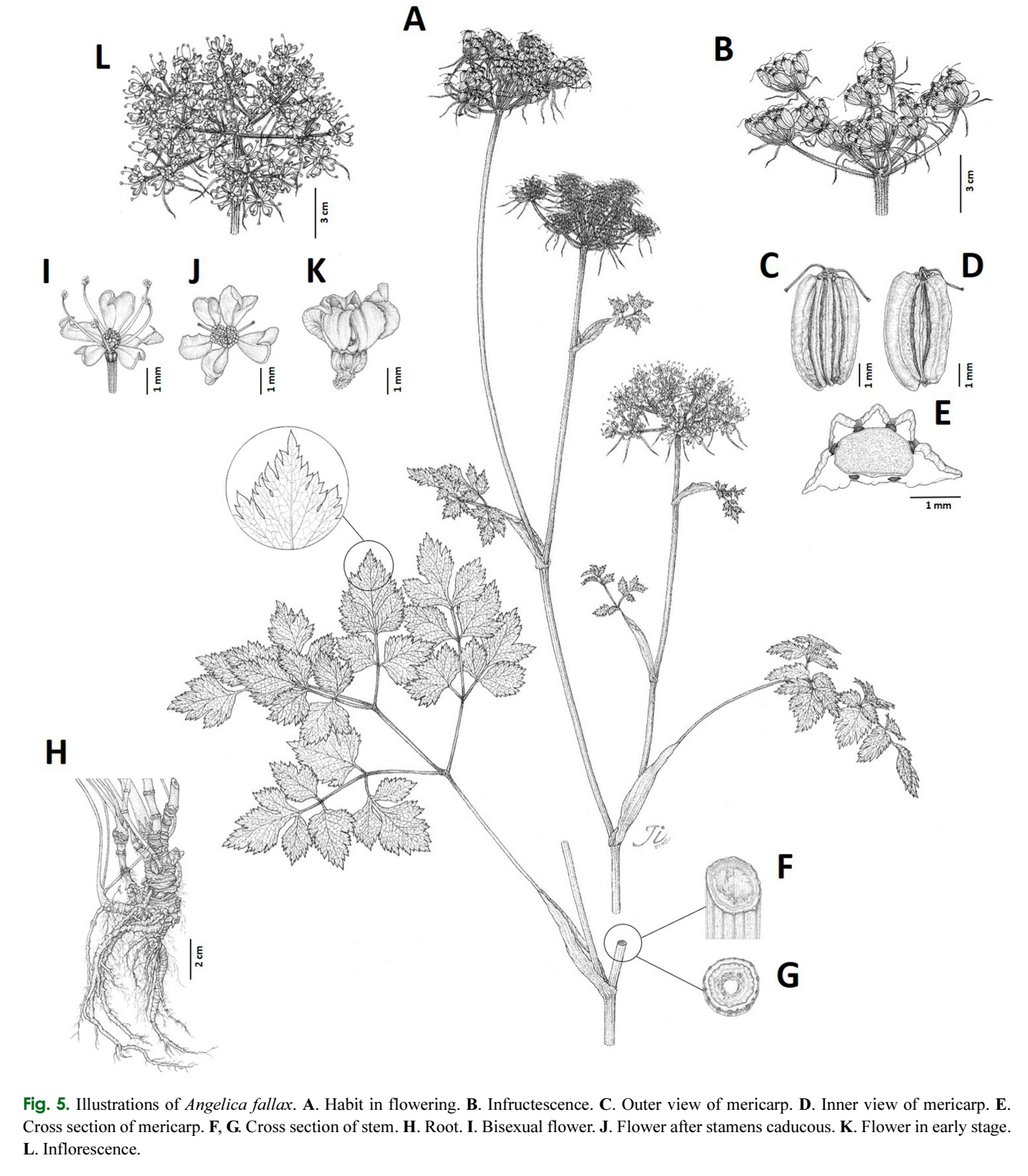 | Angelica sensu lato(산형과 Lindl., Selineae Spreng. 족, Apioideae Seem. 아과)는 북반구 온대 지역에 약 110종이 분포하며, 이 과에서 가장 큰 속 중 하나이다(Hiroe와 Constance, 1958; Pimenov과 Leonov, 1993). Linnaeus(1753)가 처음 기술한 이후로, 복엽, 등쪽으로 압축된 수과로서 가늘거나 좁은 날개 모양의 등쪽 능선, 넓은 날개 모양의 가장자리 능선, 그리고 뚜렷한 가는 띠(vittae)를 가진 것으로 인식되어 왔다(Hiroe와 Constance, 1958; Pimenov, 1968; Qin 등, 1995; Feng 등, 2009). 많은 종들이 환경에 따라 잎의 형태가 다양하게 변하기 때문에 여러 가지 하위 분류가 제안되었다(Miquel, 1867; Franchet와 Savatier, 1873; Yabe, 1902).하라, 1954; 오위, 1965; 랴오, 2012a). 또한, Angelica s.l. 종과 관련 속들 간의 관계를 규명하기 위해 많은 분자 분석이 수행되었다(Shneyer et al., 2003; Xue et al., 2007; Feng et al., 2009; Liao et al., 2012b, 2013). 형태계측학적 및 분자 분석과 면역학적, 화학적, 화분학적, 세포학적 연구를 바탕으로 Archangelica Wolf, Coelopleurum Ledeb., Ostericum Hoffm. 등 일부 주요 속들은 Angelica와 구별되어 다루어졌다(Harborne et al., 1986; Vasil’eva and Pimenov, 1991; Pan et al., 1994; Sheh et al., 1997; Shneyer et al., 2003; Shu and Sheh, 2004; Liao et al., 2013). 그러나 이전 연구들은 특정 국가의 종에만 초점을 맞추었고 전 세계를 대상으로 하지 않아 Angelica의 속내 분류를 완성하기 어려웠다. 최근 거의 모든 종을 다루는 대규모 프로젝트가 수행되었다. |