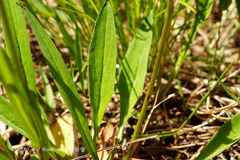근엽은 도피침상 장타원형 또는 거꿀피침 모양으로 끝이 뾰족하고 밑은 좁아져 엽병으로 이어지며 중부 이하에 치아 모양 톱니가 있거나 결각이 약간 생긴다. 경엽은 2~3개로 피침형 또는 장 타원상 피침형이고 기부가 귀모양으로 줄기를 감싼다.