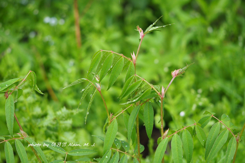 잎은 선형, 선상 피침형, 난상장타원형으로 잎 끝이 길게 뾰족하다, 2~4(5)쌍의 작은잎으로 된 짝수깃꼴겹잎이다.