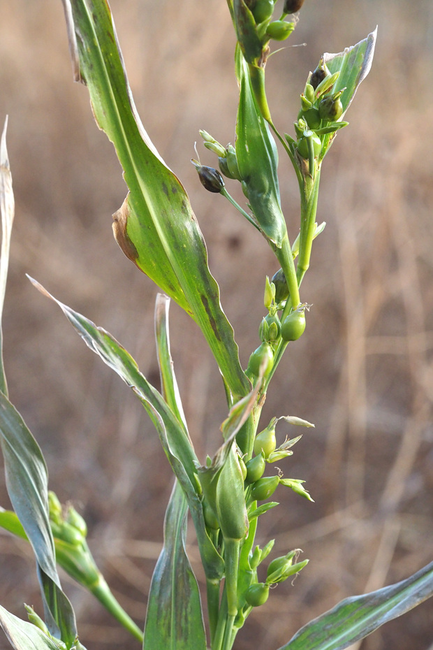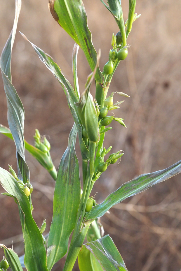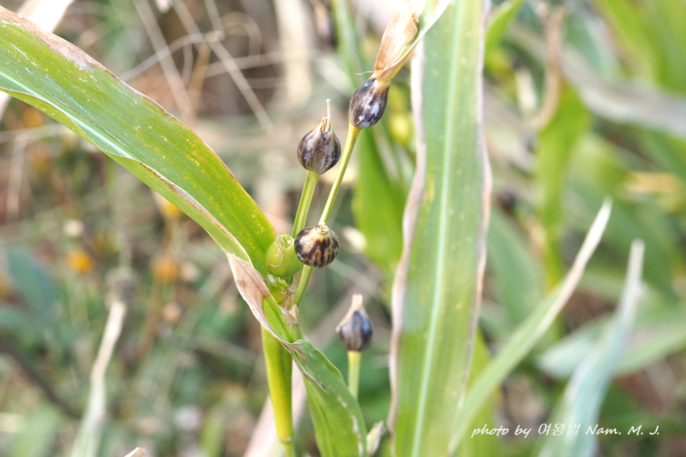 율무와 비슷하지만 염주는 항아리 모양의 총포엽 표면이 매끈하고 더 둥글며