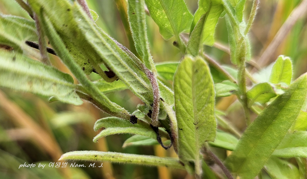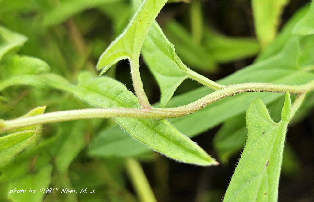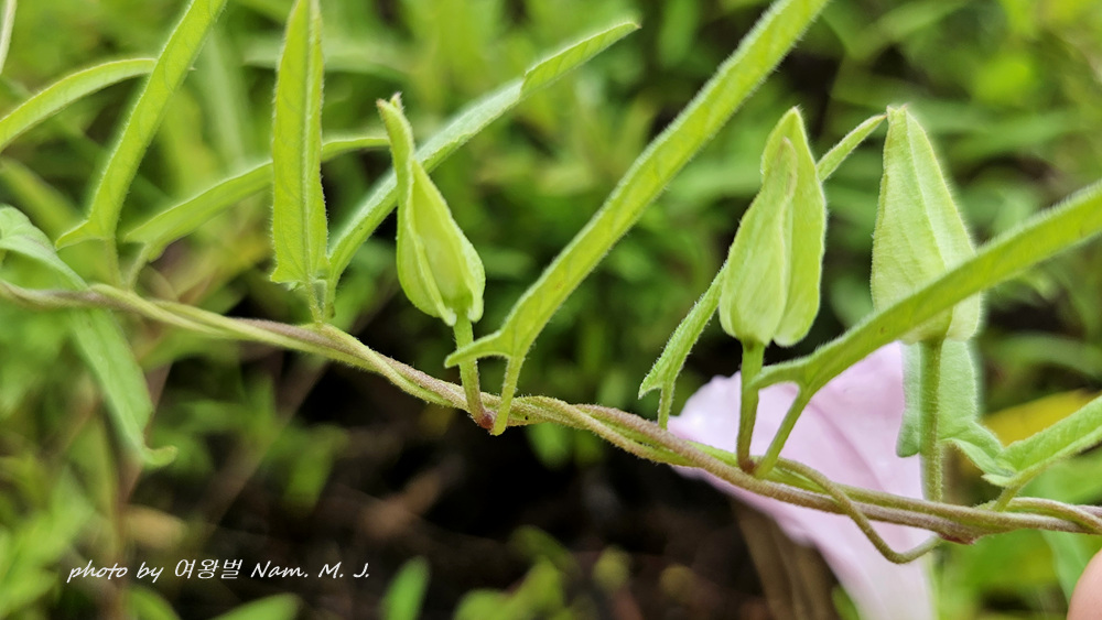 잎, 줄기와 꽃자루, 꽃받침에 털이 많고 메꽃보다 줄기가 다소 곧게 서고, 잎이 다소 좁고 짧다.