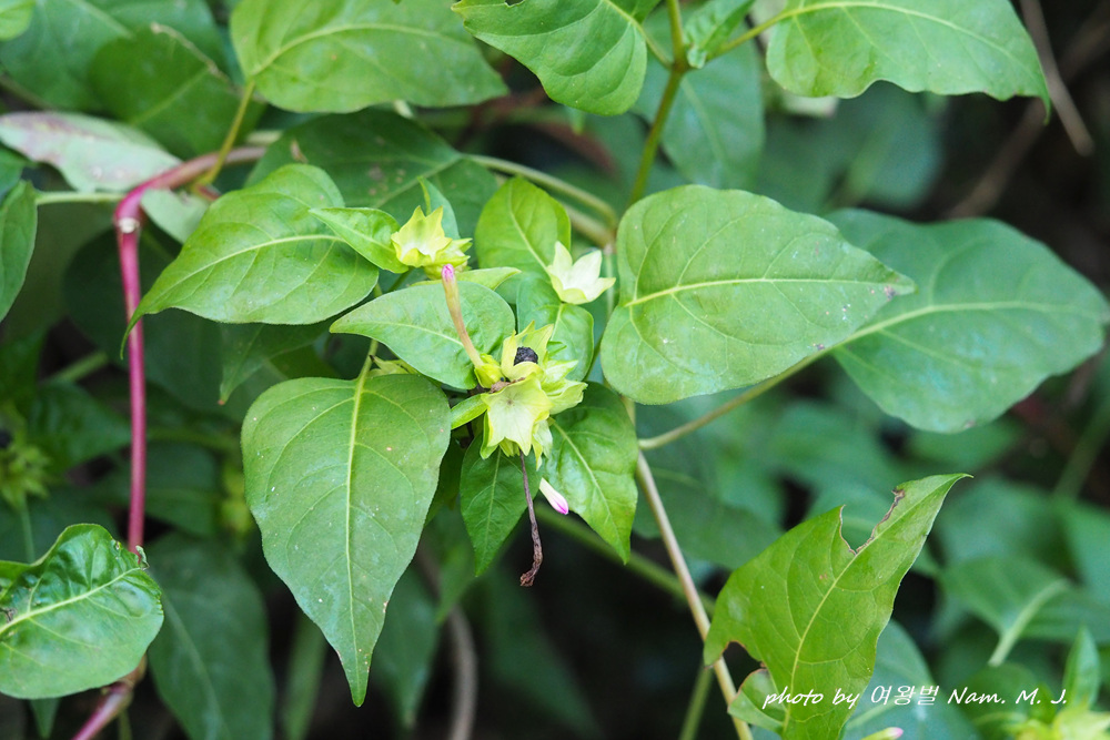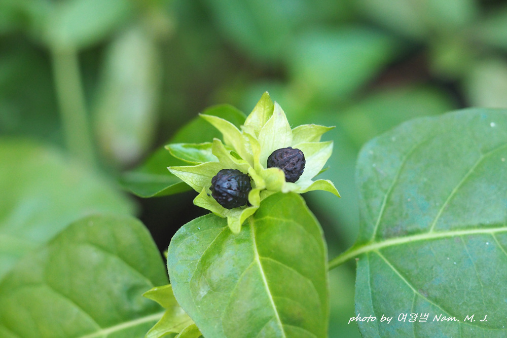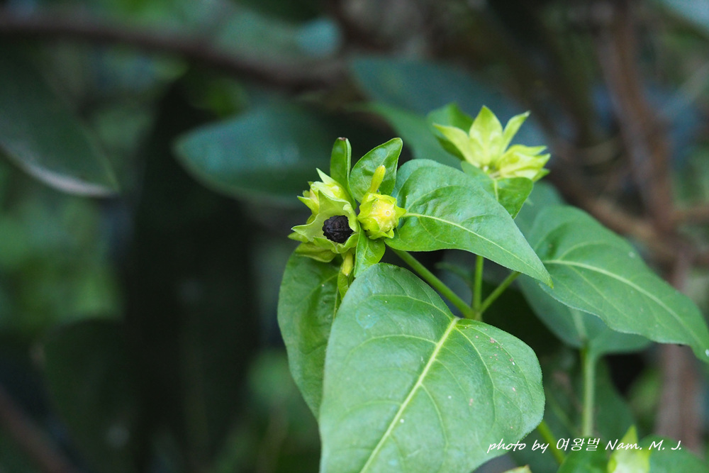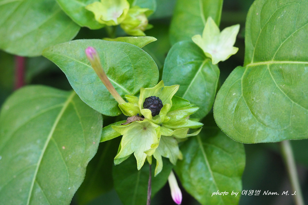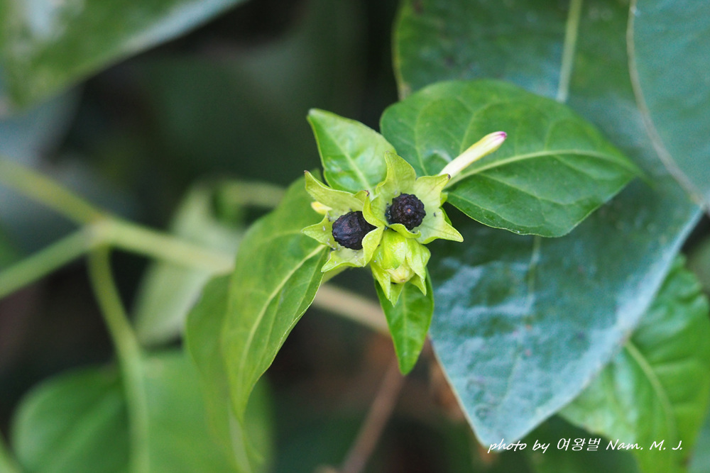 제주도 하천변을 돌아다니다가 그 분꽃이 까맣게 익은 열매를 품고 있는 것을 발견하였다.