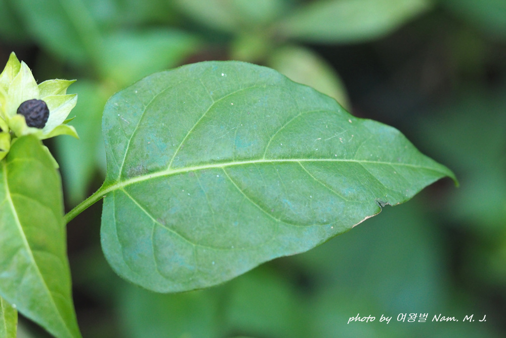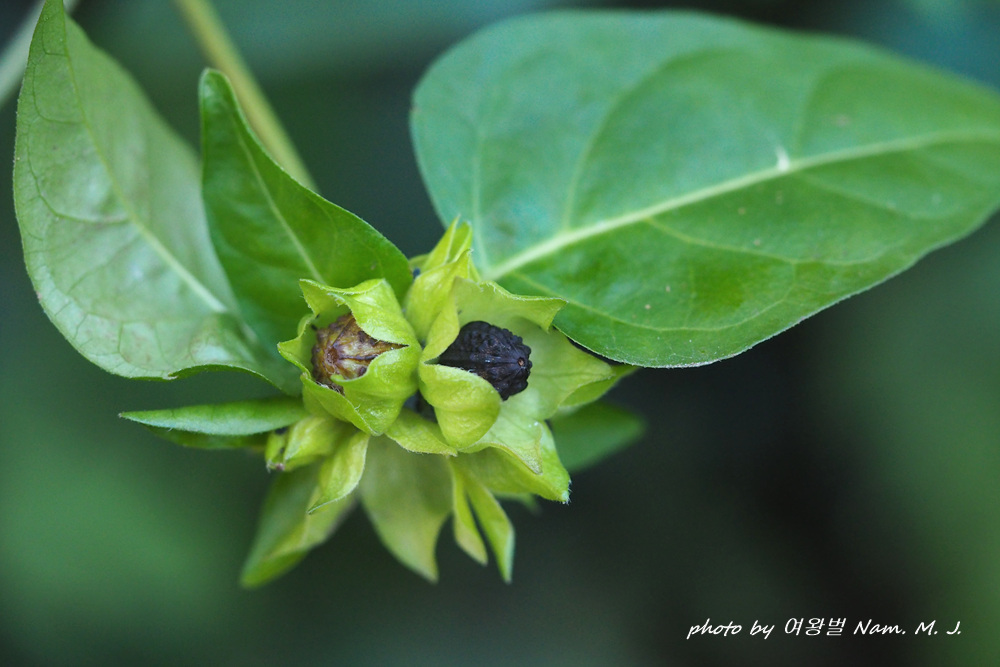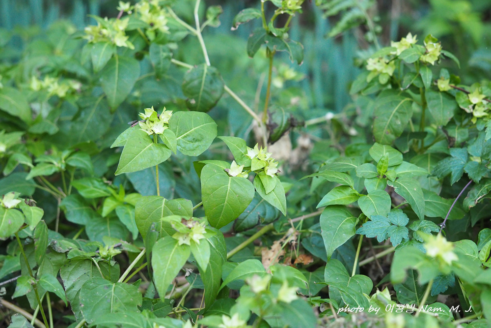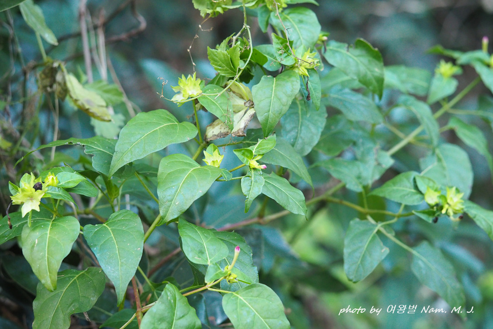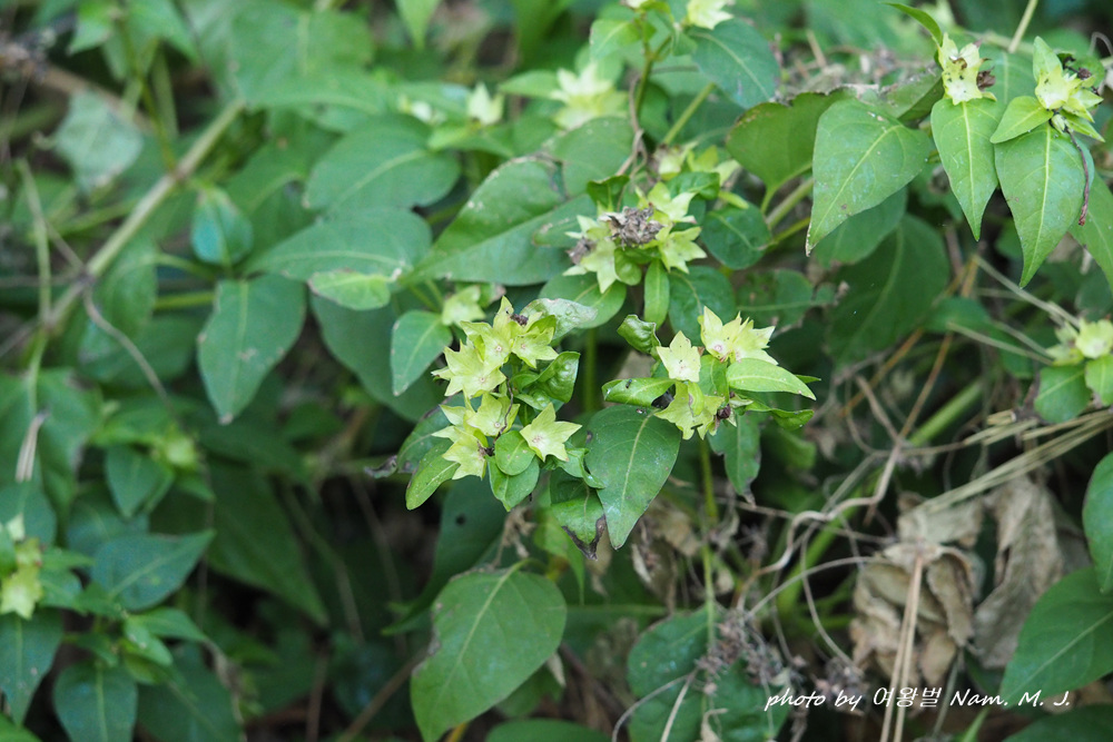제주도 하천변을 돌아다니다가 그 분꽃이 까맣게 익은 열매를 품고 있는 것을 발견하였다.