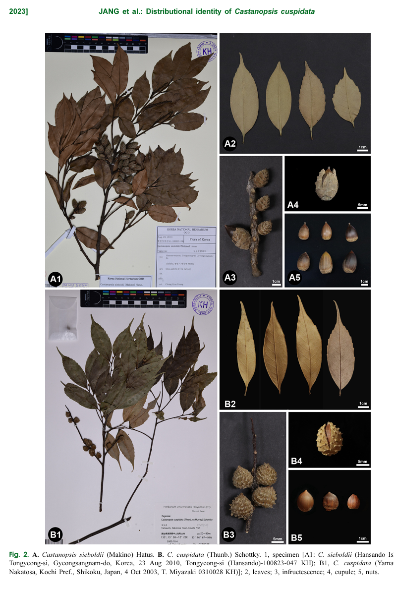 | 지난 약 200년간 Castan-opsis cuspidata가 한반도에 분포한다는 점은 의심의 여지가 없었습니다. 그럼에도 불구하고, 우리의 실증적 관찰은 이 지역에 존재하는 것에 의문을 제기하게 합니다. C. cuspidata가 한반도에 서식하는지 명확히 하기 위해, 우리는 표본관, 분포 관련 문헌, 그리고 욕지도섬의 공식 기록된 천년기념물 숲 C. cuspidata 숲을 조사했습니다. 연구 결과를 바탕으로 우리는 특히 C. cuspidata와 C. sieboldii 사이의 내과절 화축과 컵 결기의 형태학적 차이를 강조하는 분류학적 키를 제공합니다. 우리는 C. cuspidata가 한반도에 분포하지 않을 가능성이 더 높다고 결론지었습니다. 더욱이 욕지도 섬의 공식 기록된 천년기념물 C. cuspidata 숲의 모든 나무가 C. sieboldii임이 밝혀졌습니다. 이 오해는 C. sieboldii에 대한 일련의 오인 사건들로 인해 시간이 지남에 따라 점차 굳어졌을 수 있습니다. 이 연구는 1886년 Wenzig가 Geomun 섬에서 Quercus cuspidata(= C. cuspidata)에 대해 수집한 Quercus cuspidata(= C. cuspidata)의 표본 수집(1859년)을 기록한 것으로, C. cuspidata와 C. sieboldii의 구분이 아직 확립되지 않은 역사적 맥락에서 시작되었다. 또한, 우리 연구는 생물의 오인이 의학과 약리학을 넘어 인간 문화에 이르기까지 영향을 미칠 수 있음을 시사합니다. |