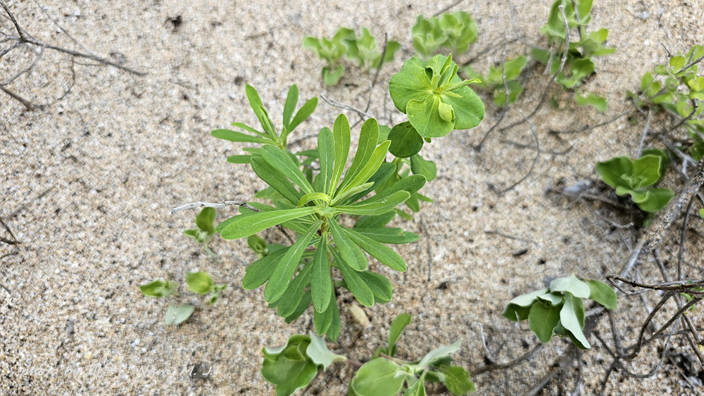 육지의 흰대극보다 키가 작고 줄기 잎이 더 넓고 끝이 주걱형으로 둔하며