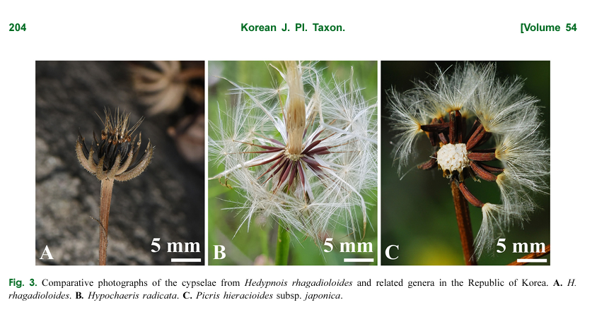 | 외래 식물인 Hedypnois rhagadioloides (L.) F. W. Schmidt가 부산 신항에서 발견되었다. 이 종이 속한 Hedypnois Mill 속은 대한민국 식물상에 새롭게 기록된 속이다. 이 속은 Hypochaeris L. 및 Picris L. 속과 관련이 있지만, 비늘 모양의 털로 이루어진 갓털(pappus)을 통해 이 두 속과 뚜렷하게 구별된다. 또한, 이 속의 식물은 열매를 맺을 때 꽃자루가 부풀어 오르고 능선이 있으며, 내총포는 단단해지고 구부러져 바깥쪽 수과 열매를 감싼다. 열매에는 얕은 세로 능선과 표면에 비늘 부속체가 있다. 본 연구에서는 H. rhagadioloides의 사진과 함께 속 및 종에 대한 설명, 그리고 형태학적 연구를 기반으로 한 식별 키를 제공한다. |
