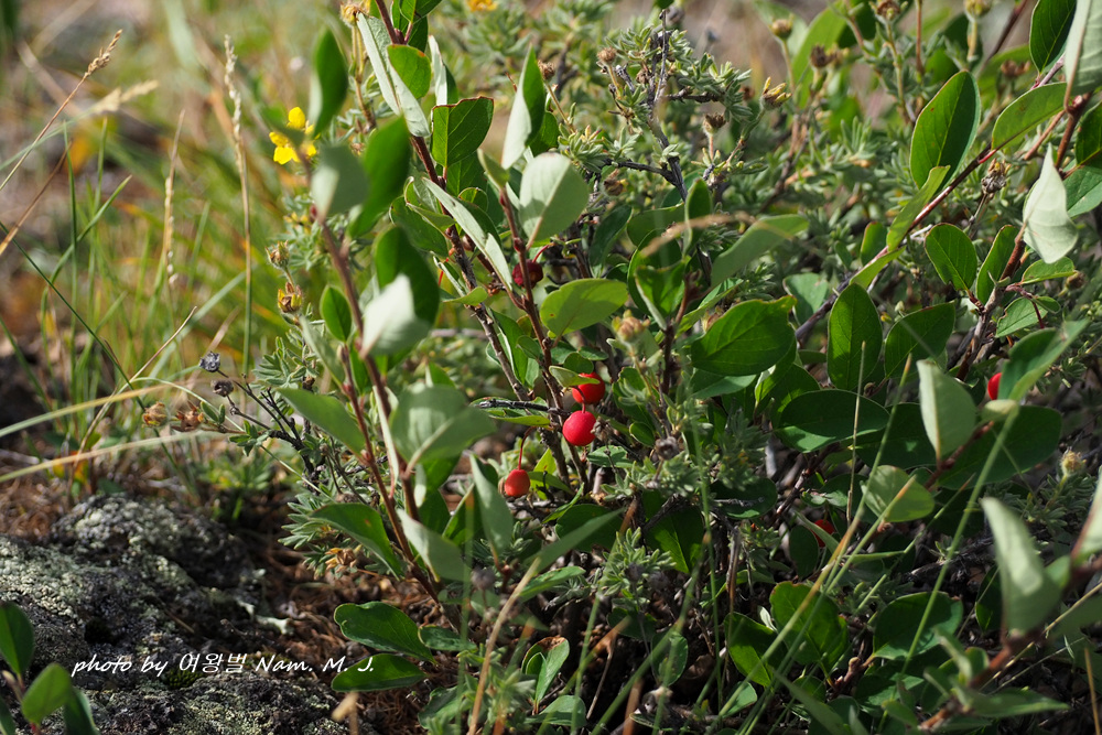 몽골에서 만나던 검붉게 익던 섬개야광나무속 녀석과 달리 잎과 붉은색으로 열매가 있고 있다.