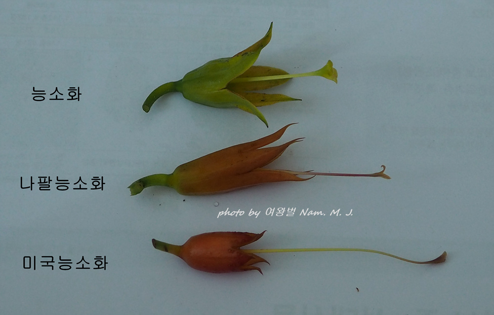 능소화는 화관이 크고 꽃색이 등황색으로 화관 통부가 넓고 짧으며 꽃받참도 녹색을 띤다.