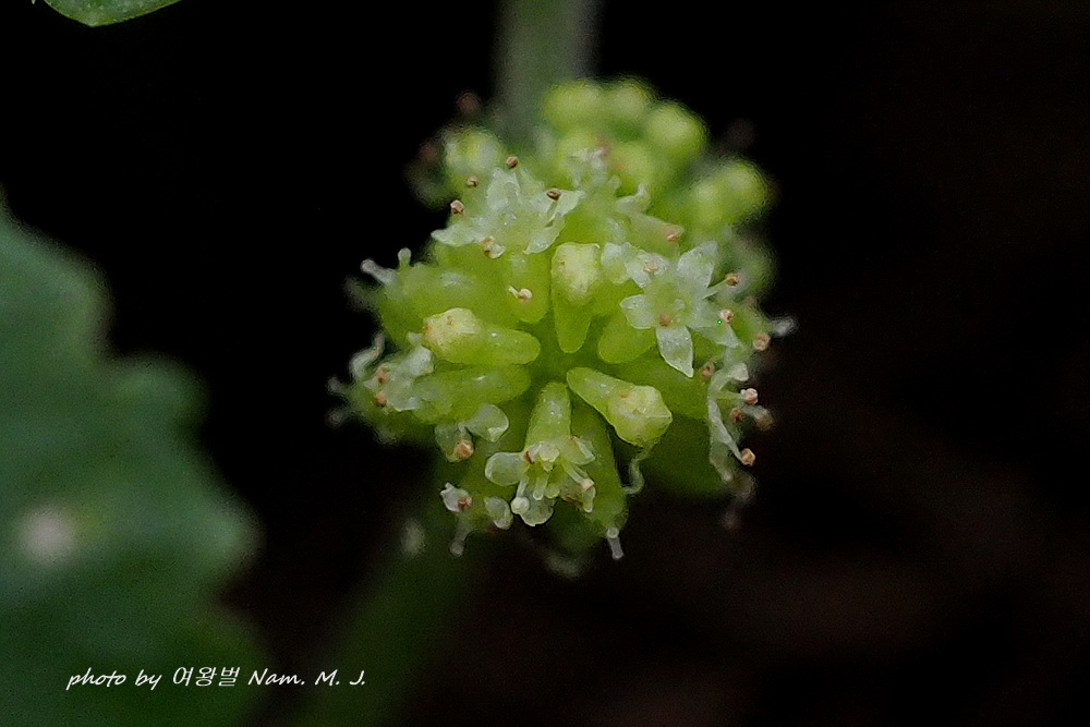 잎자루와 줄기, 잎 양면에 잔털이 많으며 화서에 녹백색 꽃이 많이 달린다.
