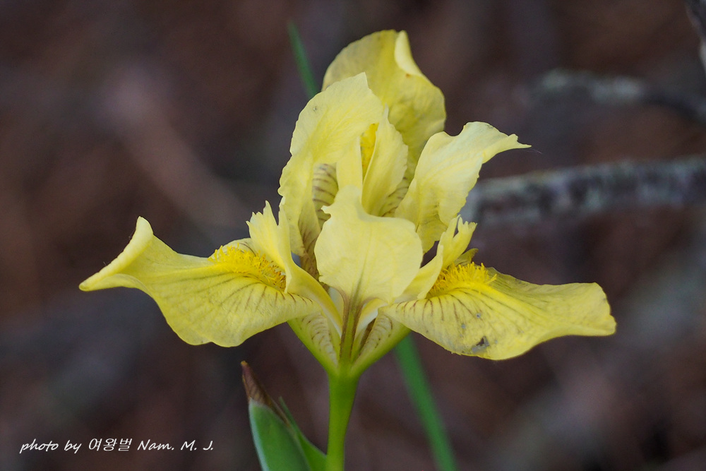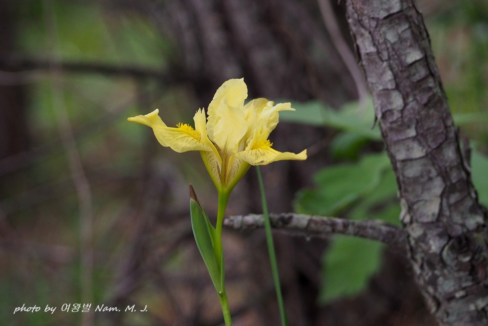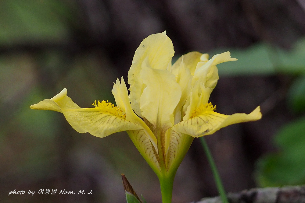 | 산지의 마른 땅에 자라는 여러해살이풀이다. 줄기는 높이 20~30cm이다. 잎은 5~6장이 모여나며 넓은 선형으로 가운데 잎맥은 없다. 꽃줄기는 1~2개, 끝에서 2개씩 연한 녹색이 도는 노란색 꽃이 핀다. 한국산 붓꽃속 식물 중에서 외화피편의 기부에 노란색 털이 밀생하는 특징으로 구분된다(출처; 국립생물자원관 포털) |
